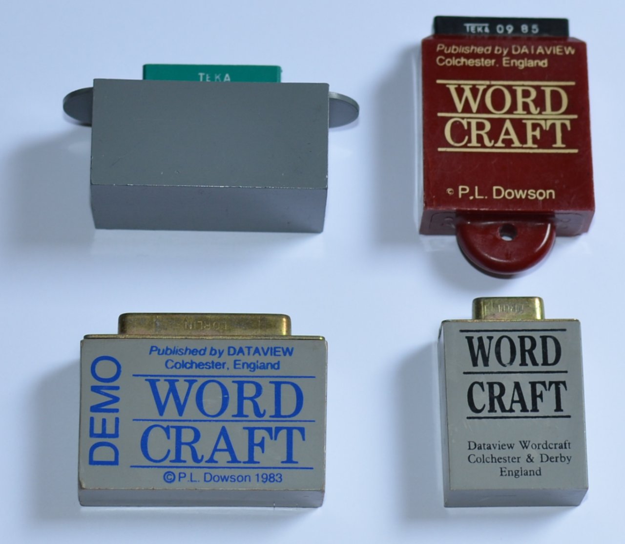 English: These dongles were used to protect the Wordcraft word processing software. Clockwise from top left: first dongle used on Commodore PET cassette port, improved PET dongle, serial port dongle for IBM PC and other computers, parallel port dongle for IBM PC. |